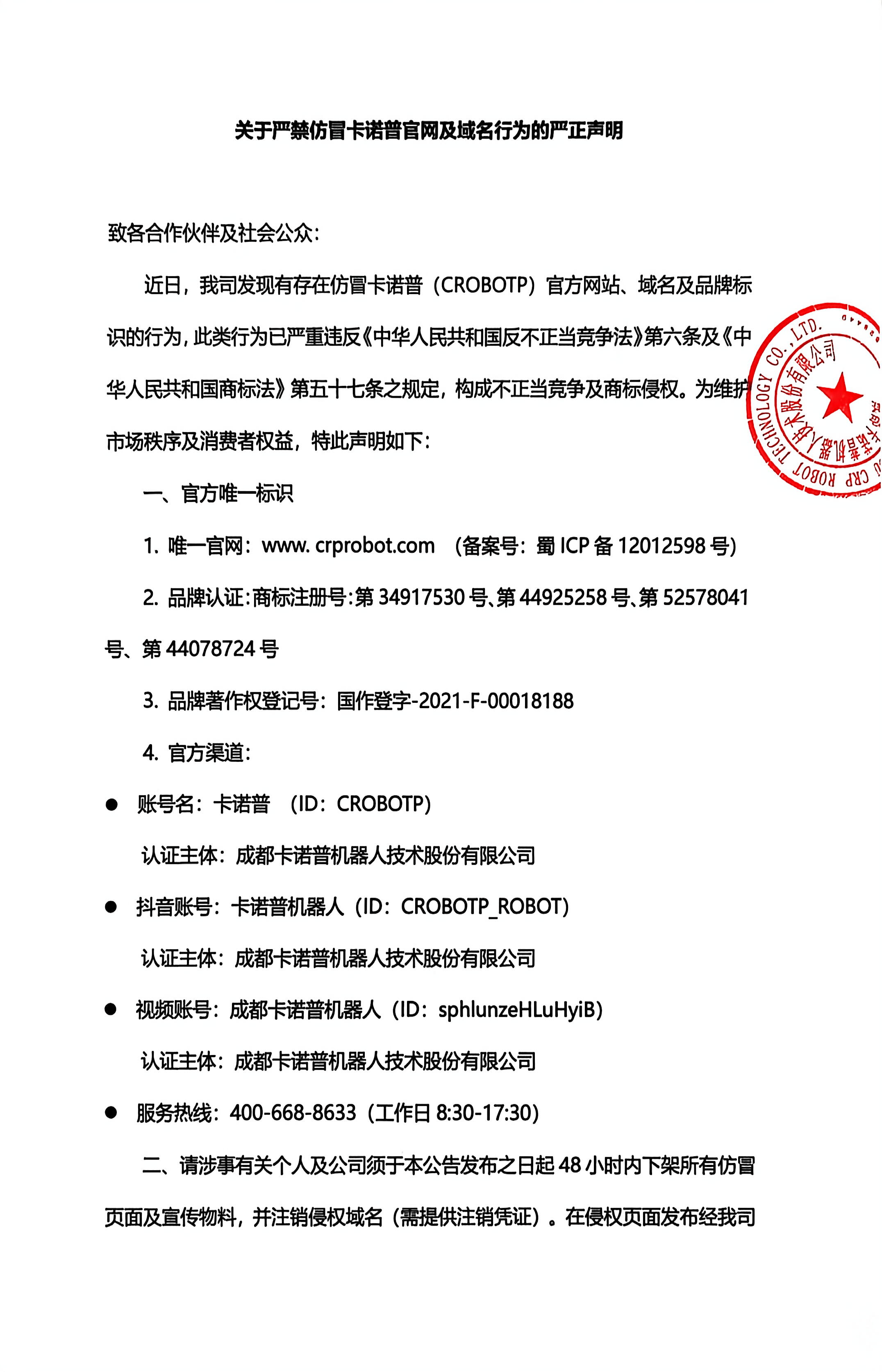 致各合作伙伴及社会公众:近日,我司发现有存在仿冒星空电竞(CROBOTP)官方网站、域名及品牌标识的行为,此类行为已严重违反《中华人民共和国反不正当竞争法》第六条及《中华人民共和国商标法》第五十七条之规定,构成不正当竞争及商标侵权。为维护市场秩序及消费者权益,特此声明如下:一、官方唯一标识1. 唯一官网:www. (备案号:蜀ICP备12012598号)2. 品牌认证:商标